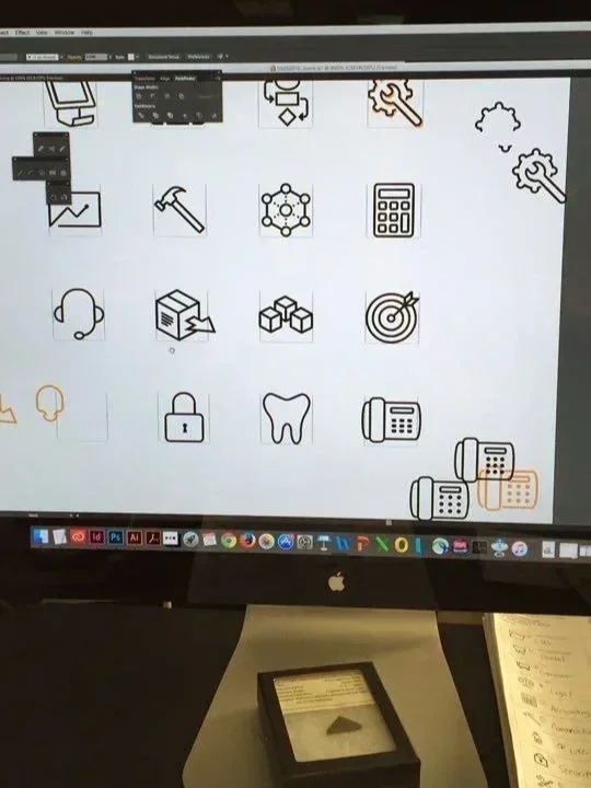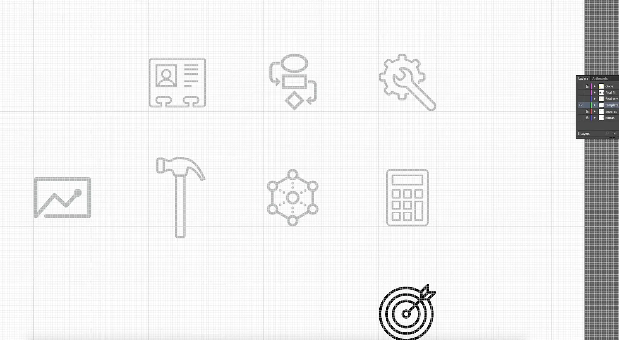 Below are two screenshots of the grid system in place that was used to ensure consistent attributes of all the icons in the set. The same stroke parameters were used in illustrator to be sure that all lines fell on the grid, and that all strokes had the same angles, spacing, and edges.