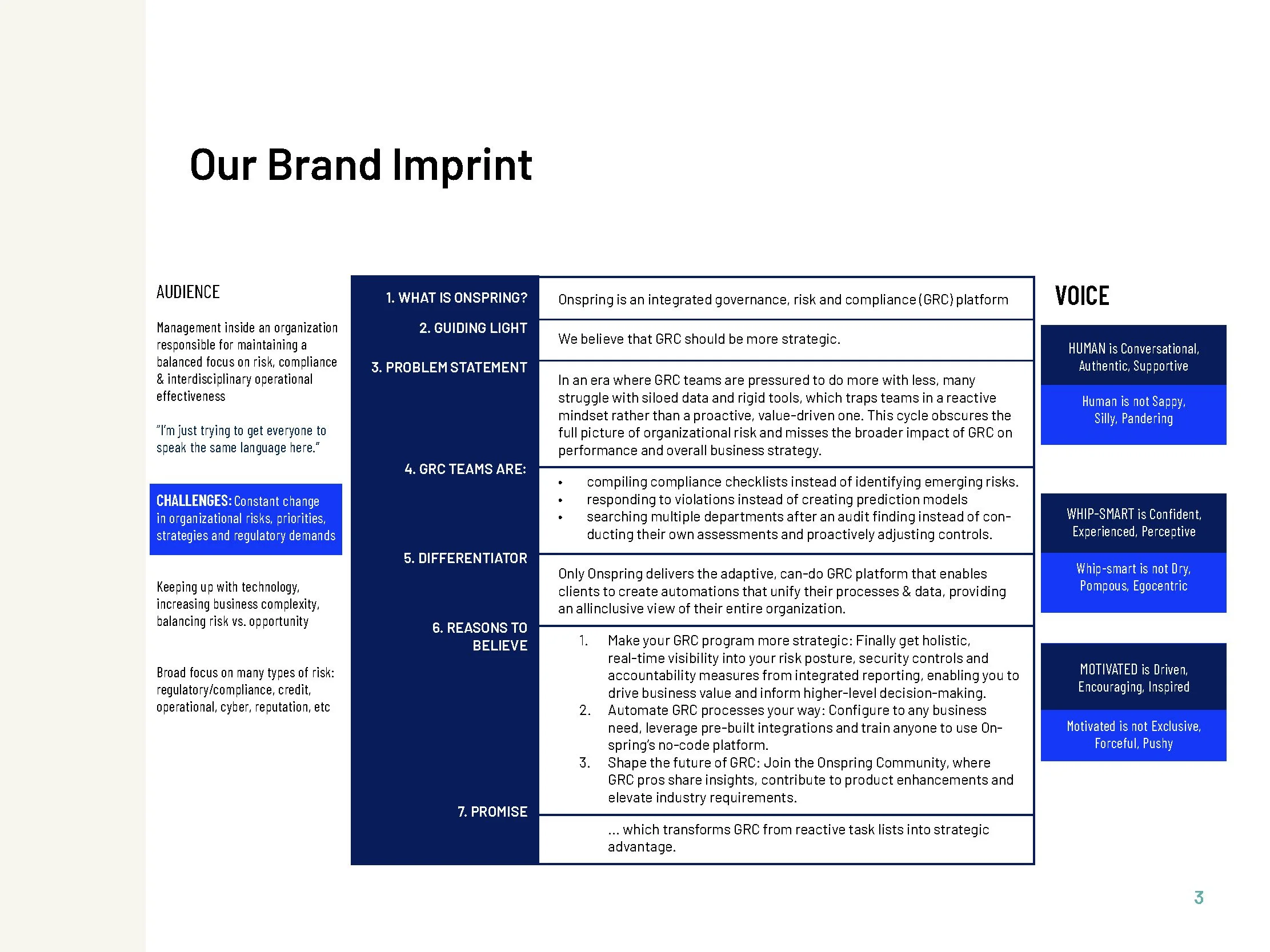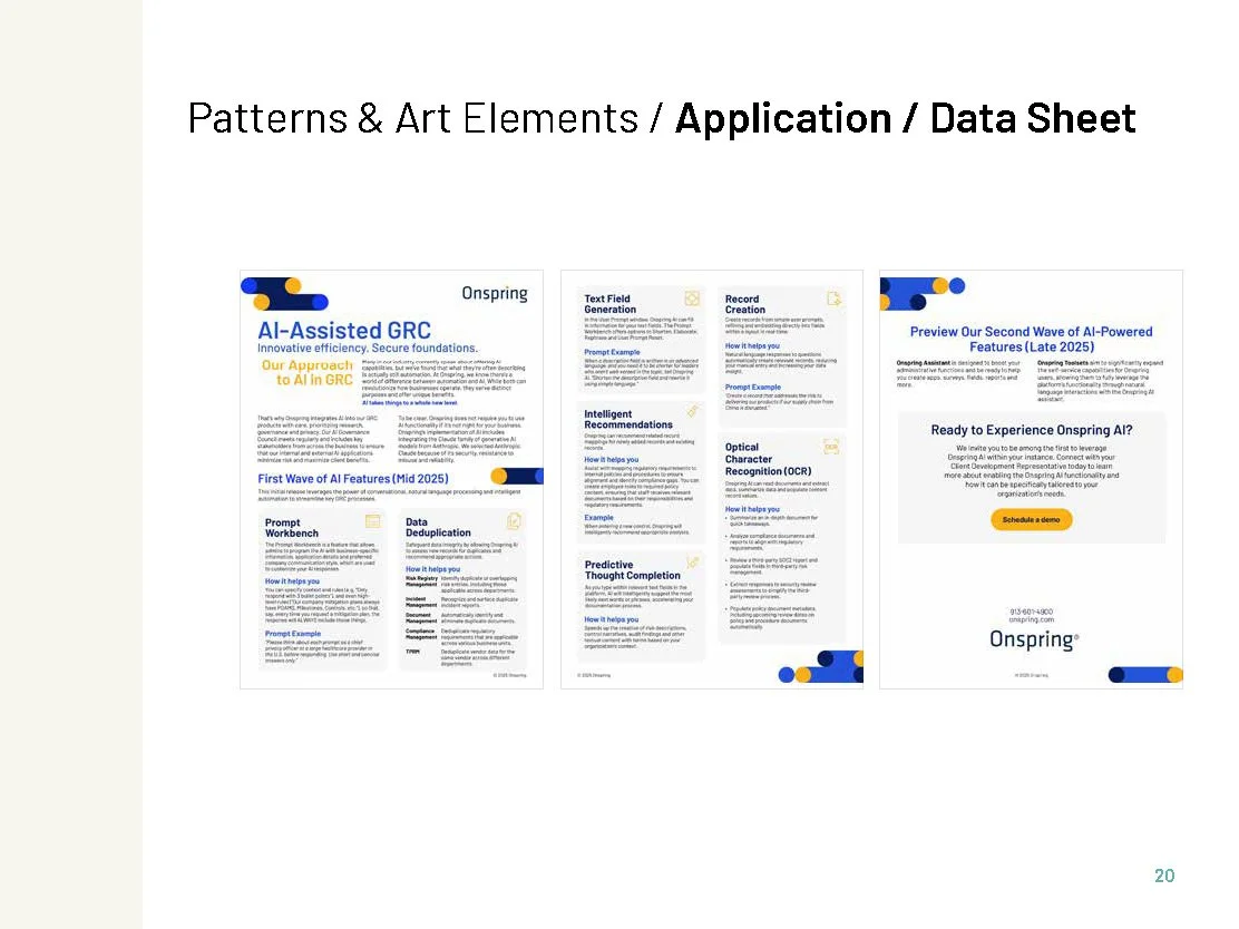 Onspring is a leading provider of no-code process automation and governance, risk, and compliance (GRC) software used by organizations worldwide to increase transparency and efficiency. As Onspring's platform evolved and its customer base grew, the company recognized the need for a brand presence that matched its innovation and enterprise reach. Condorita Design was brought on to lead a comprehensive rebrand—elevating Onspring’s visual identity, refining its voice, and unifying the brand across digital, print, and product touchpoints to reflect its bold, future-facing vision.