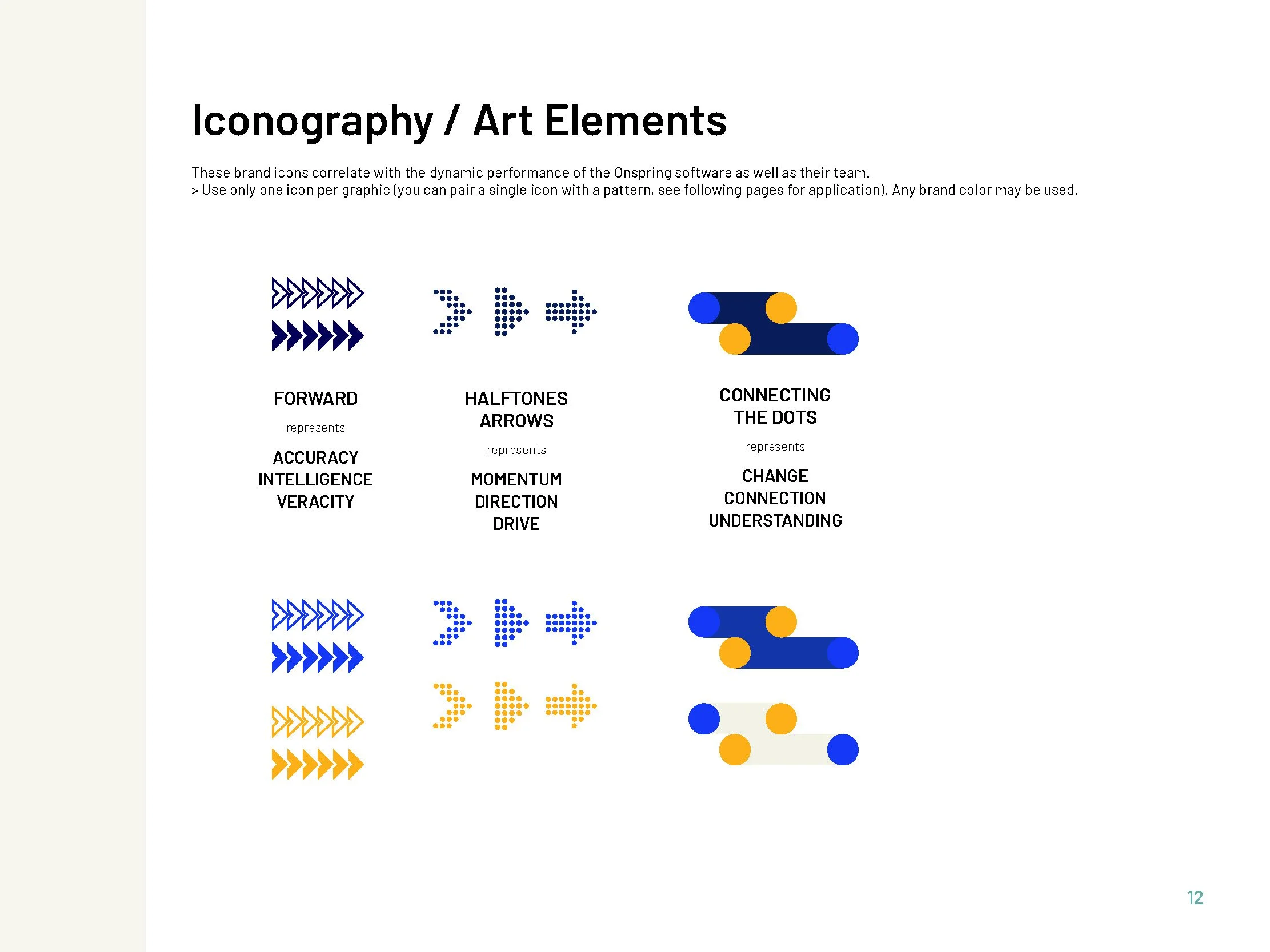 As part of Onspring’s rebrand, Condorita Design created comprehensive brand guidelines to unify the company’s visual and verbal identity. The system established clear standards for logo usage, color, typography, and tone of voice—ensuring consistency across digital platforms, marketing materials, and product experiences. In addition, a suite of customizable templates was developed to support internal teams in efficiently producing on-brand designs for presentations, reports, social media, and event collateral. Part of the brand book you can see bellow.
