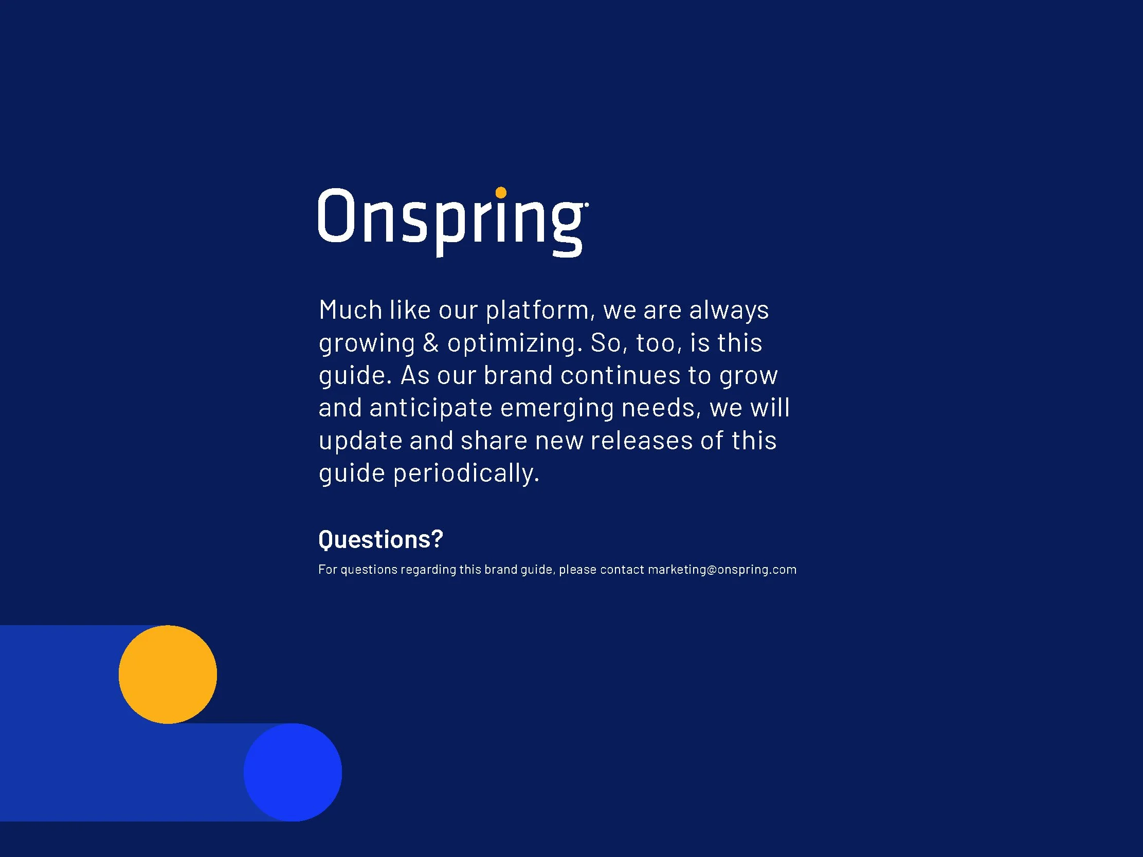 Onspring’s legacy branding no longer reflected the sophistication of its platform or the breadth of its enterprise capabilities. The company needed a refreshed identity system that could scale across touchpoints—internal and external—while maintaining clarity, consistency, and credibility for its growing global audience.